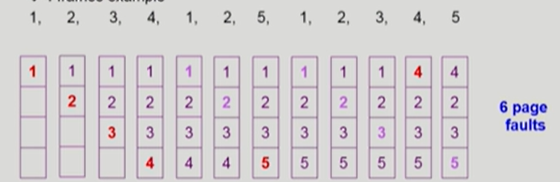 5번을 참조할 때 보면 페이지 프레임이 꽉 차서 5번을 swap in 하기 위해 4번을 swap out한다. 왜냐하면 4번이 가장 먼 미래에 참조되기 때문이다.