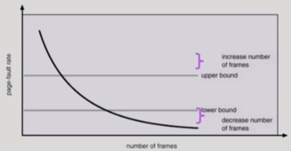 페이지 폴트를 많이 일으키는 기준이 upper bound이고 이 비율보다 많이 일으키면 워킹 셋을 보장받지 못한다고 판단해 페이지 프레임 수를 늘려준다.
