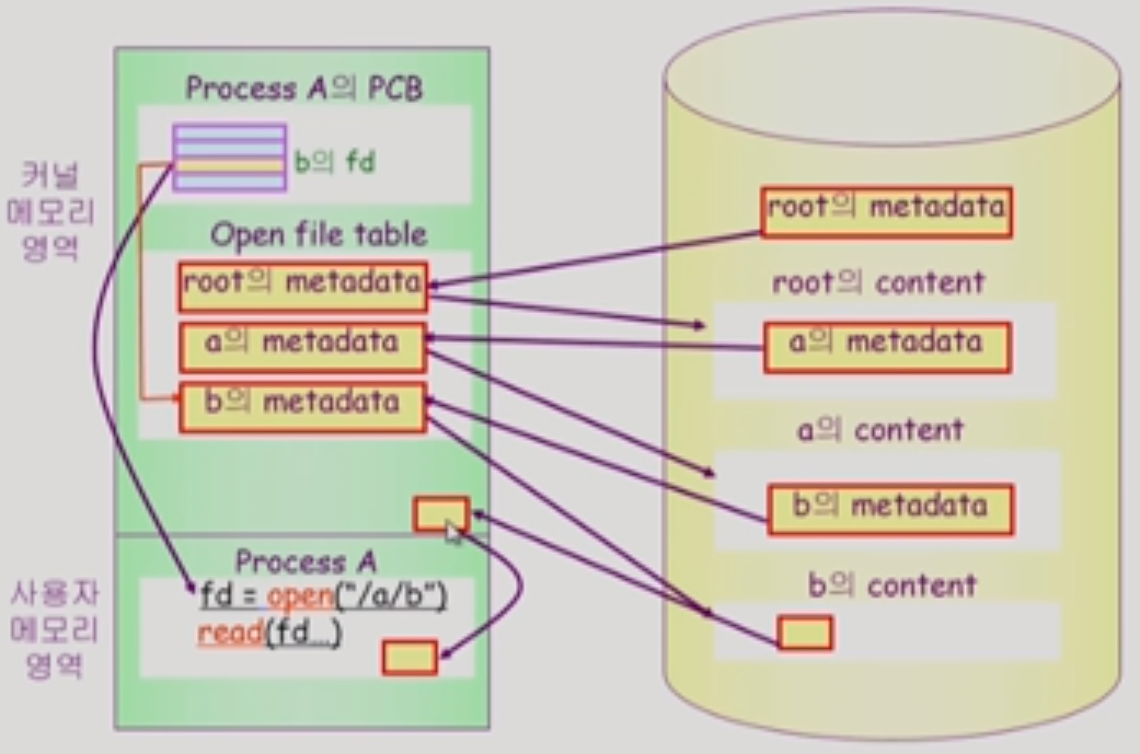 b의 메타데이터를 가리키는 포인터가 이 배열에서 몇번째 인덱스에 있는지가 open("/a/b")의 반환값이 된다.