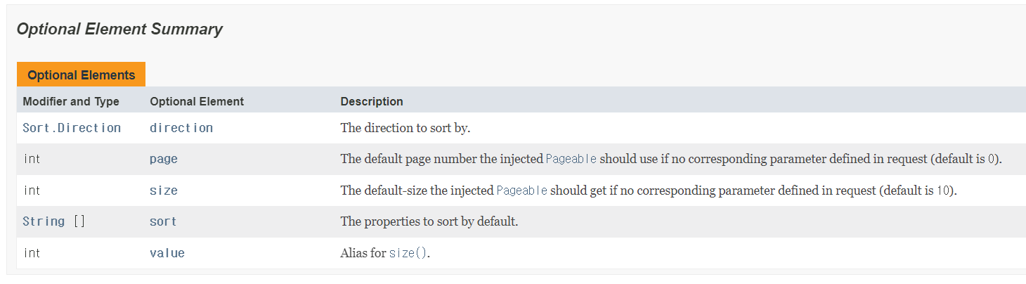 Since: 1.6 Author: Oliver Gierke, Mark Paluch Optional Element Summary Optional Elements The direction to sort by. int The default page number the injected Pageable should use if no corresponding parameter defined in request (default is 0). int The default