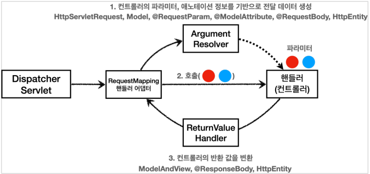 @RequestMapping(애노테이션 기반 컨트롤러)을 처리하는 핸들러 어댑터가 핸들러를 호출할 때, ArgumentResolver가 핸들러(컨트롤러)가 필요로 하는 파라미터를 생성한다. 다양한 종류의 ArgumentResolver가 있다. 원한다면 HandlerMethodArgumentResolver 인터페이스를 구현해서 사용할 수 있다.