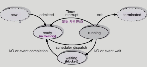 하나의 process가 CPU에서 running을 하고 있다가 timer interrupt가 들어오면 CPU를 뺏기고 ready queue의 맨 뒤로 이동해서 기다리게 된다.
