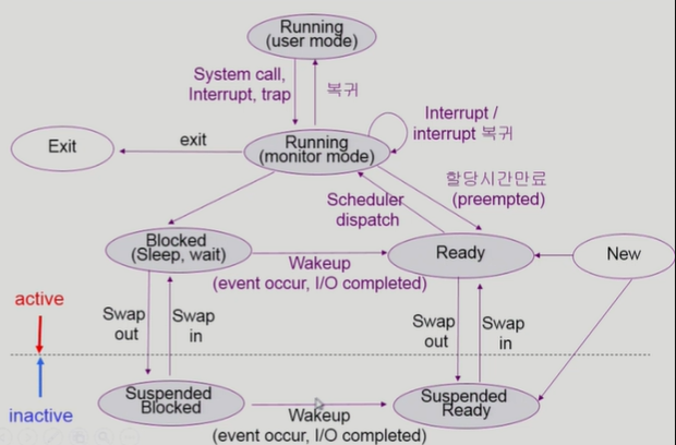 active : inactive 상태에서 외부에서 프로세스를 다시 resume 해주어야 한다. CPU를 얻었거나, 기다리거나, IO를 하거나 프로세스가 뭔가 작업을 하고 있는 상태