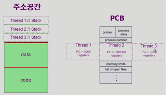 스레드가 여러개면 CPU 관련 정보인 PC와 레지스터는 각 스레드 별로 별도로 가지고 있게 된다.