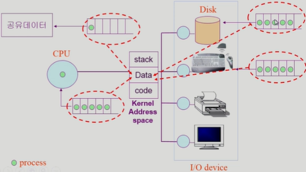 queue는 실제로 kernerl address space의 data 공간에서 관리하는 것이다. 프로세스들의 상태에 따라 CPU를 주고 말고 등을 관리한다.