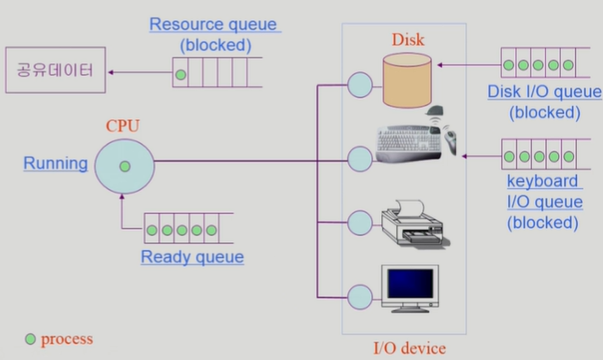 blocked 된 원인이 무엇인지에 따라 해당하는 queue (resource queue, IO queue)에 줄서있게 되고, 작업이 해결되면 ready queue로 넘어와 CPU를 얻을 수 있게 된다.