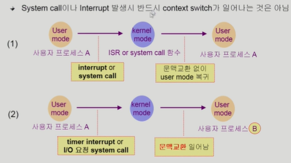 (1) 사용자 프로세스 A가 system call을 발생시키거나 인터럽트가 들어옴 -> CPU 제어권이 OS에게 넘어감 -> ISR (interrupt system routine)이나 system call 함수 수행 -> 다시 사용자 프로세스 A에게 CPU가 넘어감