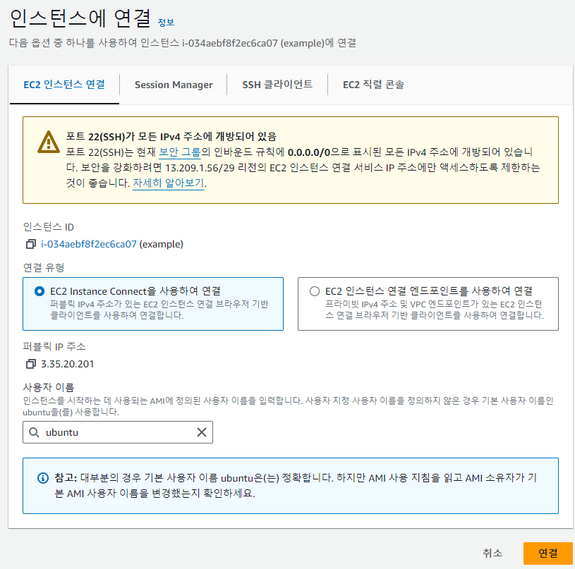 인스턴스를 연결하려고 보면 4가지 방법이 있고, 나는 위 화면의 ec2 인스턴스 연결 방식으로 바로 연결했기 때문에 key가 따로 필요없었다.